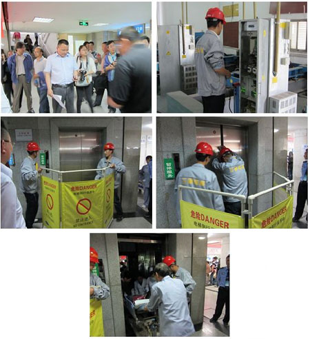 總指揮在接到電梯值班人員報告后立即啟動本院《電梯事故應(yīng)急措施和救援預(yù)案》。 兩分鐘后,醫(yī)院后勤工作人員通過電梯縫隙對被困人員進行安撫。 五分鐘后,急診部調(diào)集必備的搶救醫(yī)療器材進入搶救現(xiàn)場待命。 十分鐘后,兩名救援人員戴著安全帽,趕到事故現(xiàn)場。 十五分鐘后,電梯開始安全下降。 十八分鐘后,電梯門打開,被困人員被安全解救。