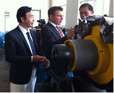 阿貝格公司專家在三星實地考察阿貝格電機的運用,對三星的國際專利三點式橋式結構無齒輪曳引機大加贊賞