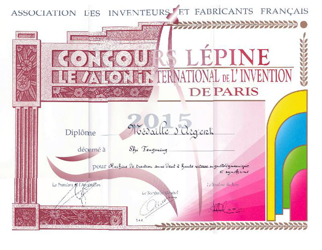 我公司"永磁同步高速無齒輪曳引機"發明專利技術榮獲2015年巴黎國際發明展覽會銀獎